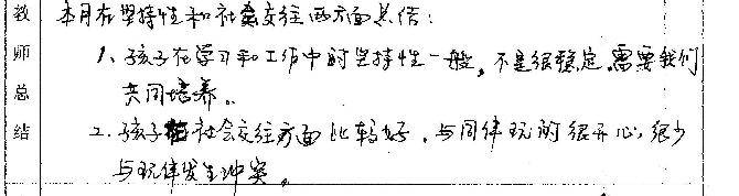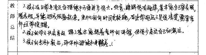 日课评价:“上课认真听”、“主动参与课堂活动”、“动作协调好”、“经过指导孩子划指(一种读书法)有进步”、“语言表达流畅,清晰”,还出现了好几个“很”字,不过可都是正面的噢!宝宝真是表现越来越棒了!加油! 5月老师评语