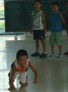 主持人把孩子们拉到教室外面的教学楼大厅里,孩子们排成一队站到游戏场地,主诗人再次重申游戏规则,孩子们个个摩拳擦掌,跃跃欲试。只听主持人发号说游戏开始,孩子们一个个都使出了浑身解数,花样百出,逗得大家哈哈大笑。有的孩子爬着走过去,再一次体验了小时候满地乱爬的感觉;有的孩子打着跆拳道走过去,时而还能摆出一个超酷的造型;有的孩子吹着唢呐走过去,仔细聆听,似乎还能听到美妙的音乐;有的孩子翻着车轮过去,时而用双手,时而用单手,真的有时还感叹孩子什么时候练就了这般身手;有的孩子走着僵尸步,嘴里不时发出那种令人毛骨悚然的声音,如果在漆黑的夜晚,听到这种声音,还真的让人不寒而栗呢。