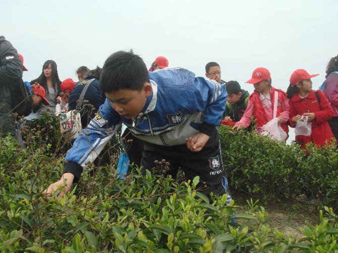 茶乡之行 星期六,河南少工委组织我们学校的同学去信阳灵山采茶。早上,我早早就起床了,收拾好后就赶到学校门口集合。 到了学校门口,已来了不少同学了,大家都在兴奋地讨论着这次的茶乡之行,充满了期待。不一会儿,同学们陆陆续续都到齐了,准备工作做完后,我们开始出发了。 大约十一点钟,我们终于赶到了目的地——灵山的一个茶场。下了车,我抬头向四周望,只见周围群山环绕,连绵不断,好像一条蜿蜒的巨龙环绕着茶场。这里的茶树漫天遍野,一层层向梯田一样整齐的排列在那里,真是壮观极了。我们这群城里的孩子从来没有见过这样的美景,大家都兴奋不已,想马上一试身手,去采摘茶叶。 可是,到底要采摘什么地方呢,大家心里都没底。这时,茶场的茶艺师告诉我们:“我们现在这时采摘的是春茶,茶树上不是每片叶子都能制成茶叶的,要采摘芽尖,一般都采一芽一叶。如果旁边的叶子已经发红或者发紫,这说明它已经老了,就不要采叶了,只能采芽尖,不然制出的茶叶会发苦的……”。同学们听完茶艺师的介绍后,就来到茶树前开始采茶。我按照茶艺师刚刚讲过的要点去寻找芽尖,真是说起来容易做起来难啊。在这么多的绿叶中寻找那么一小片芽尖还真不是件容易的事,这是需要眼力和耐力的。找到了,这个细细尖尖的像大头钉一样大小的一定是芽尖,我小心翼翼地把它采下来,还不放心,再能拿给茶艺师看。茶艺师看后说:“不错,这就是芽尖,就是要采这样的”。我照着这种形状继续采茶。过了一会儿,我觉得腰都有些酸了,就直起身来休息,顺便看看自己的劳动成果。呀,才这么点呀,茶叶总共才有我一个手心那么多。想起刚开始来的时候,碰见有几个采茶女工在采茶,当时我还觉得她们的工作真是轻松极了,在这么风景秀美的大山里,随手揪几片叶子就是在工作,真是美差。可现在,自己却刚采了那么一小会儿就开始腰酸腿疼的,真让人觉得脸红。 同学们还在那兴致勃勃的采着茶,比比你采了多少,看看我采的嫩不嫩,真是热闹极了。不知不觉吃饭的时间到了,老师开始催促着我们集合,我们只好恋恋不舍地结束了这次活动。 这次活动真是有趣极了,既陶冶了我们的情操,也让我们体会到了劳动的快乐,当我品尝着自己的劳动果实时,会感到更幸福的。 茶山美景