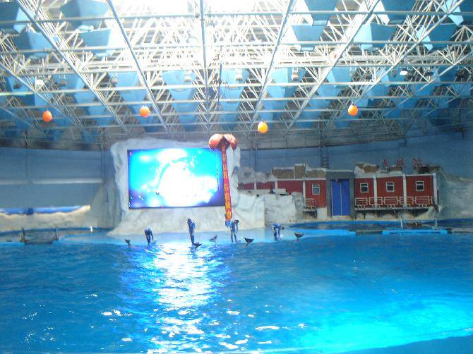 前段时间,我们集体到青岛进行学习,参观了青岛海尔、青岛啤酒厂。并有幸游览了青岛极地海洋馆。 (炮弹鱼) 那一天,艳阳高照,晴空万里。我们一行乘车来到青岛极地海洋馆。在一楼,我们看到好多好多各种各样的鱼。它们被存放到充满海水的池子中,池子是用透明玻璃做成,我们在外面可以看得一清二楚。那些鱼,色彩斑斓、美丽极了。神态可掬的企鹅,自由游弋的海龟,睡意朦胧的北极熊、全身雪白的北极狼、凶悍的鲨鱼、拖着长尾的电鳐等等。我们转了一大圈,真是大饱了眼福。接着我们陆续往出口附近集中,因为这里就要进行海豚白鲸表演。