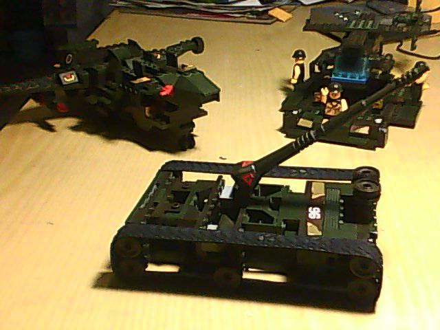 (这张里面有我组装的战斗机,不过这是从斜上方看,要是从侧面看,你一定会不喜欢它的。) (嘿嘿,我直升机上的尾炮还可以装在机场守卫上,加上了大炮,机场守卫又酷又霸气。) |