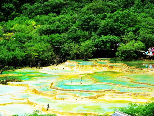 这里是著名的黄龙风景区,蜿蜒曲折,从上空看去,一个个天然形成的钙化池犹如是龙的鳞片,又由于钙化池的边缘多数为黄色,因此这个景区被称作 “黄龙”。