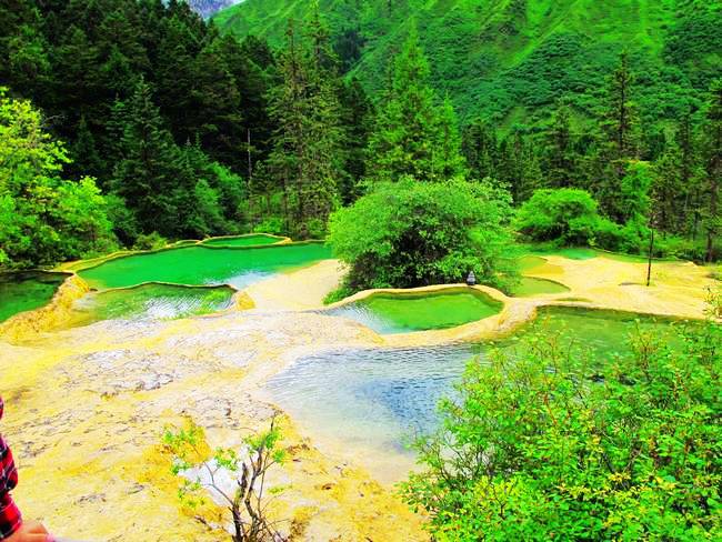 这张照片上像是一个个装了水的盆的物体——就是钙化池。黄龙风景区正是以它独一无二的钙化池吸引着众多的游客。一个个钙化池像是盆,里面盛满了翠绿的、晶莹剔透的水。不说了,拍个照做留念吧。