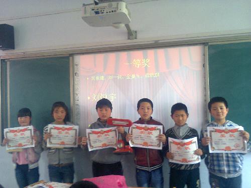 成长路上的小小庆典 ——记远航班校讯通书香班级颁奖典礼 武陟县嘉应观乡二铺营中心小学 李之梅 2014年4月2日——农历三月初三,这个鸟语花香、草长莺飞的阳春三月,对于远航班的同学来说,这是一个期盼已久的日子,按照事先与孩子们的共同约定,我们要在这一天中午第四节举行一个小小的颁奖典礼,对孩子们在河南省校讯通第十届书香班级评选活动中表现优异的孩子进行颁奖。 中午第三节的下课铃声刚刚响过,我便来到了教室里,打开电脑,连接好黑板后边的电子白板,插上U盘,循环播放《向着明亮那方》的伴奏曲,再打开昨晚自己精心准备的颁奖PPT,等待着第四节上课铃声的响起。 我们的颁奖PPT 随着第四节的到来,学校的三位中层领导和班主任王老师也搬着凳子来到了我们的教室里,此次颁奖典礼也正式拉开了帷幕。在《向着明亮那方》的伴奏曲中,我和孩子们一起通过诵读《我们这样在书香中走过》的小诗,回顾了我们三个月的写博历程,从滴水成冰的寒冬到风轻云淡的暖春,从浓雾弥漫的冬至到草长莺飞的春分,573篇参赛博文如573个小脚丫,印在我们写博成长的沙滩上。 接着,此次远航班校讯通第十届书香班级颁奖典礼进入了正式的颁奖环节,首先颁发的是鼓励奖,梅文君和李晨阳两名同学走上讲台,领回属于自己的奖状,接受全班同学的祝贺。当我提到梅文君同学家里没有电脑,利用寒假到亲戚家走亲戚的机会写博文的时候,这个班里平时最调皮的同学眼角竟然闪现出一滴泪水,害羞的红晕不知什么时候爬过他的脸颊。 获得进步奖的两位同学(左边为梅文君同学) 接着,所颁发的是三等奖、二等奖、一等奖—— 三等奖:耿佳辉、张子瑄、毛胜嘉、金永斌、屈文杰、赵锦涛、王旭东、金梦琪、吴银凤、秦梦锦、张泽军(合计11人) 二等奖:刘泽钦、金朝、张文杰、姜萌波、黄永辉、张骞、谢秋红、金文琪、王彤、张依琳、索子莹、郭慧莹毛瑞琴(合计13人) 一等奖:吴承键、刘一恒、金曼玉、范欣琪、刘恒宇、王紫洋(合计6人)