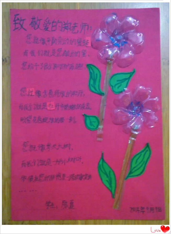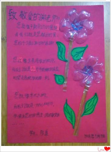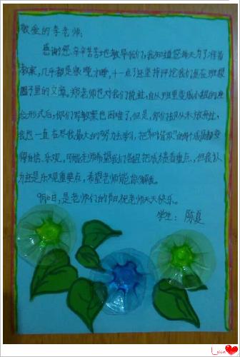 妈妈小语:第30个教师节来临之际,女儿夏夏用她自己的方式表达出对语文和数学两位老师节日的祝福,昨天晚上7点多到11点多,构思、手工制作、文字传情,四个小时的时间终于完成,看着她疲惫但却开心着的笑容,为她这份美好的心意喝彩!陶行知先生说过一句话“捧着一颗心来,不带半根草去。”今天是所有教师们的节日,真诚地对人类灵魂的工程师说声:“您们辛苦了,祝亲爱的老师们教师节快乐!天天好心情!!!