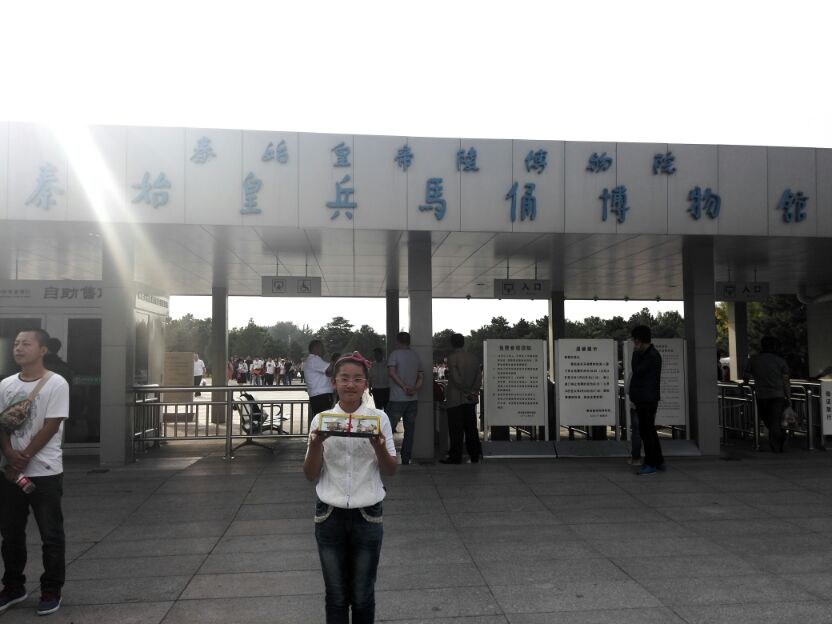 坐了四、五个小时的车,让我觉得很累,在过到了兵马俑景点,我又兴奋了起来。我们先买了票,然后去到了3号坑,3号坑根本就不算坑,算一个馆。我们被人挤来挤去,只看到了一个坐在马车里,手里拿着僵绳,前面停着几匹马,逼真级了。2号坑是名副其实的一个“坑”,只有坑,没有兵马俑,坑人哪!1号坑门口大排长龙,我们排了十几分钟队才进去,进去之后我傻眼了,这么多人,跟下饺子一样,我们走进去,不,准确的来说是被人挤进去的,我挤到坑前,放眼看去,那里一排排陈列着兵马俑,特别壮观,就连无头俑都有,好可笑......第一天的行程就在拥挤的人群中结束了