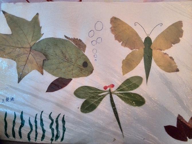 秋天到了,树叶纷纷落了下来,有各种各样的树叶,好漂亮呀,老师让我们捡回来做一副树叶画。我和妈妈在放学的时候去小花园捡了一些树叶,有银杏叶、柳树叶、竹叶、梧桐树叶还有一些不认识的叶子。爸爸下班后我就请爸爸和我一起完成。我们用我的好朋友党哲瀚送给我的一张大纸开始了我的树叶画。我们用银杏叶做蝴蝶的翅膀,用梧桐树叶做金鱼的尾巴,还用红色的不知道什么树的叶子做了三叶草。爸爸还用彩笔给蜻蜓画了个红色的