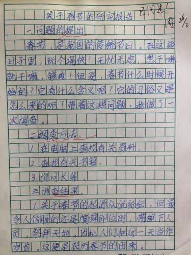 关于春节的调查报告 一、问题的提出 春节,是我国的传统节日。在这些日子里,我们小孩子放了假,玩的痛快,无忧无虑,想干嘛干嘛,够爽!但是,春节什么时候开始的?它有什么含义?它的习俗又是怎么来的呢?带着这些问题,我做了一次调查。 二、调查方法 1、在电脑上查找有关资料。 2、查找有关书籍 3、询问长辈。 三、调查结果 1、关于春节的起源众说纷纭,但最令人信服的还是虞舜即位时,带领部下人员,祭拜天地。因此人们把这一天当作岁首。这便是农历春节的由来。 2、春节象征着一年之始。俗话说:一年之计在于春。人们在春节这段时间可以总结过去一年的得与失,计划新的一年里准备做什么,怎么做。使人们对未来充满希望。 3、春节主要习俗: (1)、守岁,即旧年最后一天不睡觉。传说太古时期,有种恶兽叫“年”。专食飞禽走兽、鳞介虫豸,一次换一种口味,从磕头虫到大活人,让人谈“年”色变。后来,人们知道了它每365天来一次,于是人们在那一夜不睡觉,闲聊壮胆。 (2)贴门神。 相传,鬼在阴间干了伤天害理的事,有两位叫神荼、郁磊的神人便将其捆绑,送去喂虎。人们便在桃木上刻上他们二人的模样,用来避邪。 四、结论 春节是中国最隆重也最有特点的节日,是合家团圆、走亲访友的日子。因此,它不仅是一个节日,也是中国人和亲朋好友欢聚聊天、使情感得以释放的日子,是我们永远的精神财富! |