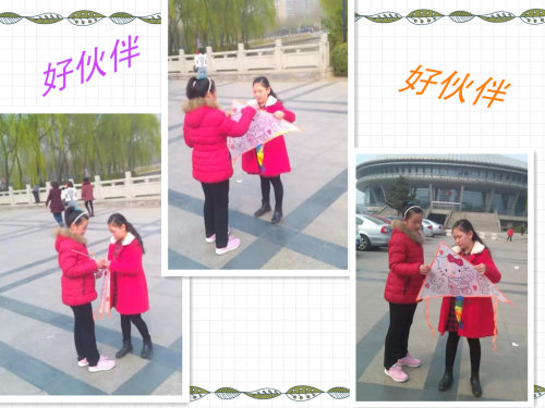 接下来,我们就要为下午的放风筝做准备了。要求两人一组,我和刚刚认识的一个姐姐一组。我们拿到了一个画着“可爱阿狸”的漂亮风筝,两个人拿着不同颜色的马克笔,在风筝上写下了自己美好的梦想和祝福。