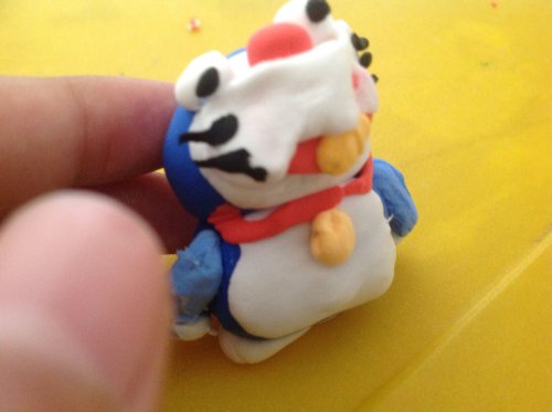 【酷我魔法】动手玩黏土 嘿!这炎炎夏日,我们一起呆在家里玩黏土吧!今天我先教大家做动漫人物多啦A梦(也就是机器猫)。 1.首先,搓两个蓝色的圆球,上下组合在一起作为哆啦A梦的头和身体。(注意:两个圆球要一样大小,因为身体还有双脚在支撑。) 2.搓两个蓝色椭圆和两个白色圆球,拼合在一起,作哆啦A梦的胳膊和手。(注意:蓝色椭圆形状就像棒球杆,上粗下细;白色圆球是哆啦A梦的手,所以不要太大。) 3.搓两个白色柱体作哆啦A梦的脚。(注意:柱体不要太大,底尽量厚一些,支撑起来比较好。照出来的效果不是特别好,弟弟搓的不是特别规范,不过开心就好!) 4.把搓好的胳膊、手和脚与身体和头组装起来。(注意:左右胳膊要对称放,可以稍稍抬起,比较可爱。我的胳膊和头、身子用了不同的蓝色,这个看自己喜好哈。) 5.搓白色圆球,擀成薄片。粘到头部,用同样的方法做白白的肚皮粘在身体上。(如果没有特殊工具,可以用手掌压一压,薄片是最重要的,一定要比蓝色圆球小。可以再圆一些,下图形状有些变形……) 6.搓黄色圆球,用工具刀在上面压住铃铛的印记。(同样,如果没有工具刀,可以用牙签刮出上下各一条铃铛痕。图不是太明显哈。) 7.揉一条红色长条,和哆啦A梦的脖子一圈的长度差不多。用一小块橘黄色黏土作舌头。再用一个红色小球做鼻子。然后把前面黄色铃铛和这次做好的铃铛的绳子、舌头和鼻子与头组合到一起。(这次忘拍图了哈) 8.用白色黏土,食指来回搓,搓成一个小圆柱,中间细一些,然后稍稍压扁。 9.用手搓六根黑色细条,作哆啦A梦的胡子,一边三根,粘到刚才那个小圆柱上。(注意:细条尽量保持长度相同,粗细均匀。)搓两个白色小球,作哆啦A梦的眼睛,中间可以再加一个黑色小点,也是用黑色黏土。然后把眼睛组合在头上。(注意:黑点一定要小,一点点就够,太大了反而不好看。) 好啦,一个哆啦A梦就做好啦!(哆啦A梦是弟弟做的,我在旁边拍照记步骤。嘿嘿嘿,虽然和动画片里的有差别,但是开心就好哈!) 你们学会了吗? 炎炎夏日,在家做做手工,陶冶陶冶情操,锻炼锻炼大脑,活动活动手指,不也是个不错的选择吗?让我们一起快乐地度过假期吧!