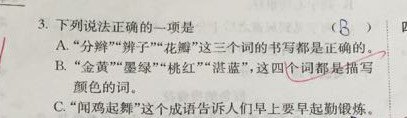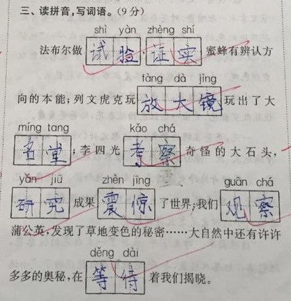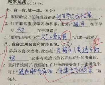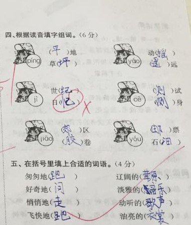 | 接班半学期了。真快呀。一直想写些什么,跟家长们聊聊,但一直忙碌的不可开交。现在有了一个非常好的契机——期中测试。卷子刚刚改完。90分以上的22人。不及格的4人。 写这篇试卷分析,不是为了让家长们看到谁家孩子学的好,谁家孩子学的不好,不是攀比,而是孩子对考虑知识点的掌握,以及学习习惯的养成。 语文的学习,从来都不是一时半刻的努力就可以收获好成绩的,我们的母语博大精深,终其一生尚不能琢磨透,所以孩子们的学习,必须脚踏实地、扎扎实实、什么时段学什么、一步一步走好、走稳,才能学好语文。 长话短说,我们开始分析试卷。 第一题,听力。听力短文共读两次,读之前有三到五分钟的时间看题。看题的目的在于对题有大概的了解,稍后听的时候有侧重。听力材料是读两遍,中间停两分钟,孩子们可以把记住的答案写在卷子上,然后准备第二次听。这次的听力题非常简单,所有答案都在原文中出现,没有任何需要孩子们理解的部分。所以这道听力题,说白了就是考察孩子们的倾听能力。倾听能力差,除了听力题做不好之外,课堂的听课效率也可想而知。 第二题,选择。 本题重在测试孩子对生字读音的掌握,以及在答题时的细心程度.如果这题出错,说明孩子平时在课堂上读书不够、早读读书不够、老师上课正音时没注意听,同时也可能是做题不够细心。 这道题出了三个生字的笔画、笔顺。这是一二年级重点教授的知识,如果出错,说明基础知识掌握不够扎实。 这道题考察的是孩子对课本的熟悉程度,因为这些都是课本里的知识。A和C选项的错误非常的明显。所以,这道题稍微用心就可以得分的。 这题中的三句话,都是课文中的原句。如果出错了,从以下几点找原因:1、预习要求读课文5遍,读够了么?2、每天早读来读课文,读了么?3、每次课堂上读课文,读的时候是在认真读、认真记,还是在应付差事? 这是个难题。难点在于学生对冒号引号的使用刚刚接触,这学期才讲的,是个难点。但这又是个非常简单的题,因为这三句话全是课文中的。我们为什么一直强调读课文的重要性?就是因为课文里不仅有生字、词语,有修辞,有积累有感悟,连标点符号的使用都是非常好的示范。不用心的孩子,往往不能注意到这些细节。那么对应的,学习的能力也会相对薄弱。 这道题考察孩子们对生字的掌握。生字我们是在课堂上都讲,难的生字除了讲怎么识记、怎么区分,还会让孩子们当堂写一写。字帖、抄词语、听写,都是识记生字的途径。这么反反复复几遍下来,还记不住的生字,肯定有,但不应该很多。如果孩子生字错误率很高,就一定要找原因。为什么做了这么多,生字的学习效率还是这么低?写字的时候是不是一边写一边玩?识记生字很差的孩子,强烈建议在家的时候陪伴孩子做游戏,游戏的内容就是让孩子说说怎么记生字。小学期间,语文的最保底的要求,就是会认2500个生字,其中1600个左右的生字是要求会写的。 四、五两题考察的是孩子对“语文园地”的掌握情况。这些基本上都是课本上出现的知识点。虽然细碎,但都应该掌握。 第六答题是个综合题。没有难度。出错的往往是错别字。 七、八大题检测的是孩子们对“日积月累”和古诗的掌握情况。每个单元的日积月累和每册的古诗,都是要求会背会默写。但凡写拼音,都是要扣分的。这些内容我们都进行抄写、默写多次,如果还出错,一定要让孩子自己反思为什么识记的效率这么低。 第九大题考察的是课内阅读。出的几道题我们在课堂上全讲过。如果孩子不会,说明当时没听明白。或者上课跑神,压根没听。 第十大题是课外阅读,课外阅读是最能检测孩子综合语文能力的题目。因为有需要归纳、总结的题,也有谈感受的题。谈感受通常来说就是对全文中心的总结。这样的题目想得到高分,除了考试时细心之外,更重要的是平时阅读课外书,有大量的阅读做铺垫,这样的题孩子们做起来得心应手。相反,不爱阅读、阅读量不够的孩子,只依靠一个学期学32篇课文训练语文能力,提升速度太慢了。语文学习,三分课内,七分课外。课外书的阅读,千万不要疏忽。 本次测试题型多,考察面广泛,能比较全面的检测孩子的语文学习成绩,因此将这张卷子做以分析,是希望咱家长在辅导孩子学习的过程中,明白哪些地方是孩子必须投入大量的精力和时间去完成的。孩子成绩不重要,重要的是我们要看到成绩反应出的孩子的薄弱点,从而有针对性的去努力,去追平。另外,养成好的学习习惯,更是好成绩的保证。很多孩子在家里,家长帮助思考、帮助做题,孩子反而自己丧失了思考的能力,也逐渐丧失了思考的欲望,甘愿做一个“婴儿”。这样的父母一定要反思,我们的好心,正在一点点蚕食孩子的学习兴趣,正在一点点磨灭孩子学习的热情。看似我们很“尽职尽责”,实际上在做着最愚蠢的事。再没有比养个“巨婴”更悲哀的事了。 在此也再次强调,孩子的作业,不需要咱家长仔仔细细的跟着一起做,尤其不能让给孩子养成依赖心理,不会的就问家长。我们培养孩子的目的在于让孩子自己学会学习。我们家长要做的: 1、监督孩子按时完成,书写干净、整洁。 2、监督读书、背诵任务,尤其是预习、读课外书、背诵古诗、日积月累等。这些“看不见”的作业,最容易被忽视。所以这类作业必须见家长签字,我们才相信孩子已完成。 3、