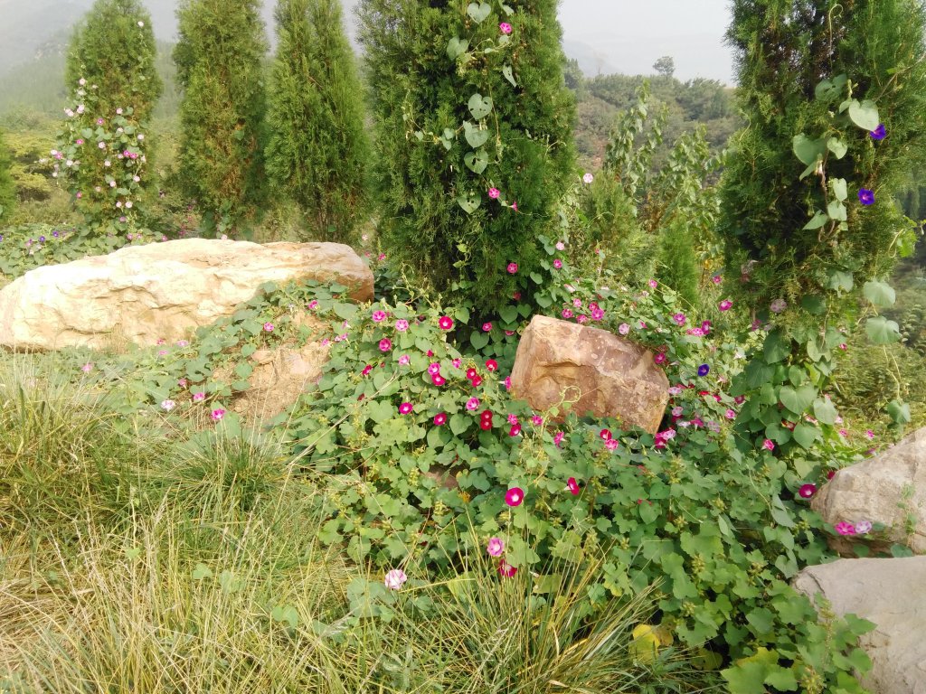 在景区门口,一片片姹紫嫣红的牵牛花在向我们微笑,有几个巨大的铜字“洪谷山风景区欢迎您”,我们在那里拍照留念,然后便走进了景区。